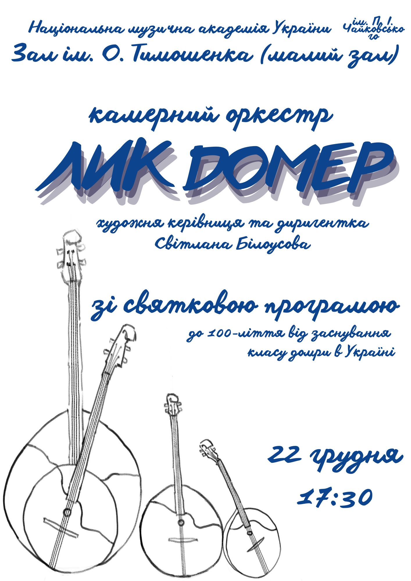 Афіша та програма концерту камерного оркестру "Лик домер" до 100-ліття від заснування класу домри в Україні. Художня керівниця та диригентка "Лик домер" – доцент кафедри народних інструментів НМАУ ім. П. І. Чайковського Світлана Білоусова. Соліст: домристи Світлана Білоусова, Аліна Прокопенко, Анастасія Дякова, Алла Кирилюк, Антон Чеботарьов, Анна Ізотова, Владислав Ульянєєв. Партія сопрано – Катерина Ткачук, партія контрабасу – Назар Матковський. Ведуча концерту – Катерина Ткачук. В програмі концерту – твори Д. Клебанова, А. Чеботарьова, О. Некрасова, Д. Снігірьова, Дж. Ґершвіна, Б. Стронька, А. Бацині, З. Алмаші. Захід відбувся 22 грудня 2024 року в Малому залі ім. академіка О. Тимошенка Національної музичної академії України ім. П. І. Чайковського.