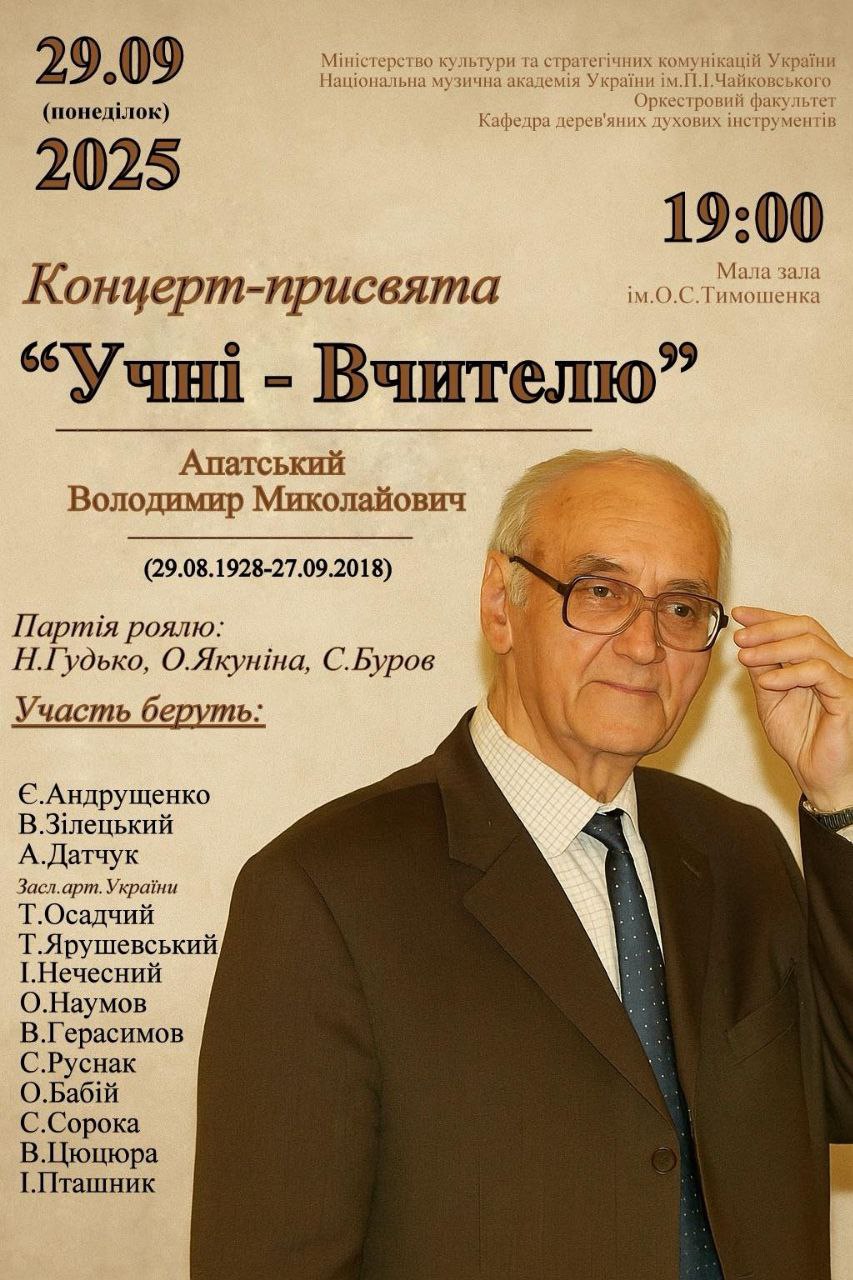 Міністерство культури та стратегічних комунікацій України НМАУ ім. П.І. Чайковського. Кафедра дерев'яних духових інструменітв. до 90-річчя кафедри духових та ударних інструментів. Афіша Концерту-присвяти "Учні-вчителю". Апатський Володимир Миколайович (29.08.1928-27.09.2018) Партія роялю: Н.Гудько, О.Якуніна, С.Буров.