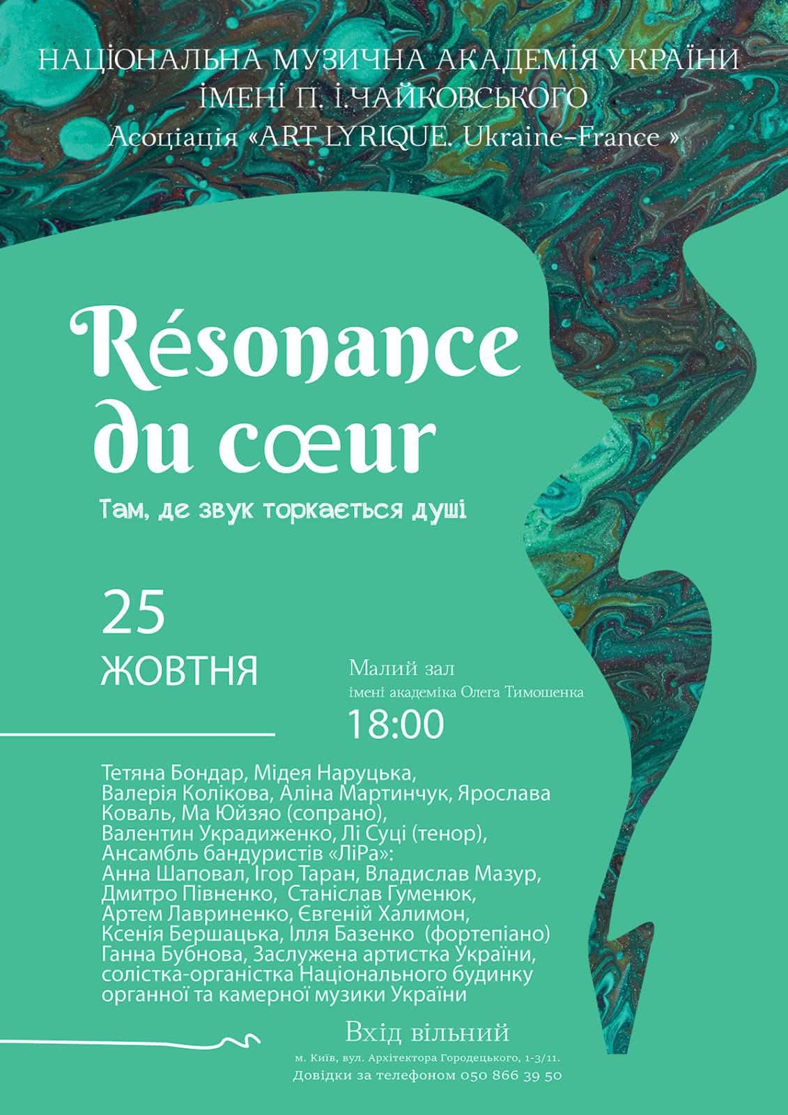 Афіша концерту "Résonance du coeur", який відбувся 25 жовтня 2025 року у Мілому залі імені академіка Олега Тимошенка