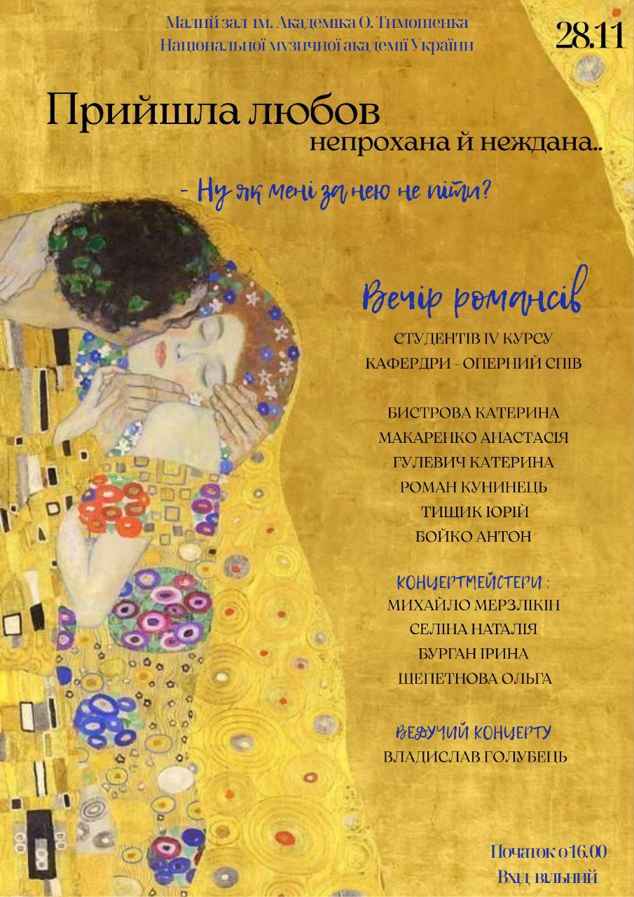 Афіша вечора романсів «Прийшла любов непрохана й неждана…», що відбувся 28 листопада 2025 року у Малому залі імені академіка О. Тимошенка Національної музичної академії України. Концертний проєкт представлений студентами IV курсу кафедри оперного співу та присвячений темі кохання в камерно-вокальній музиці.