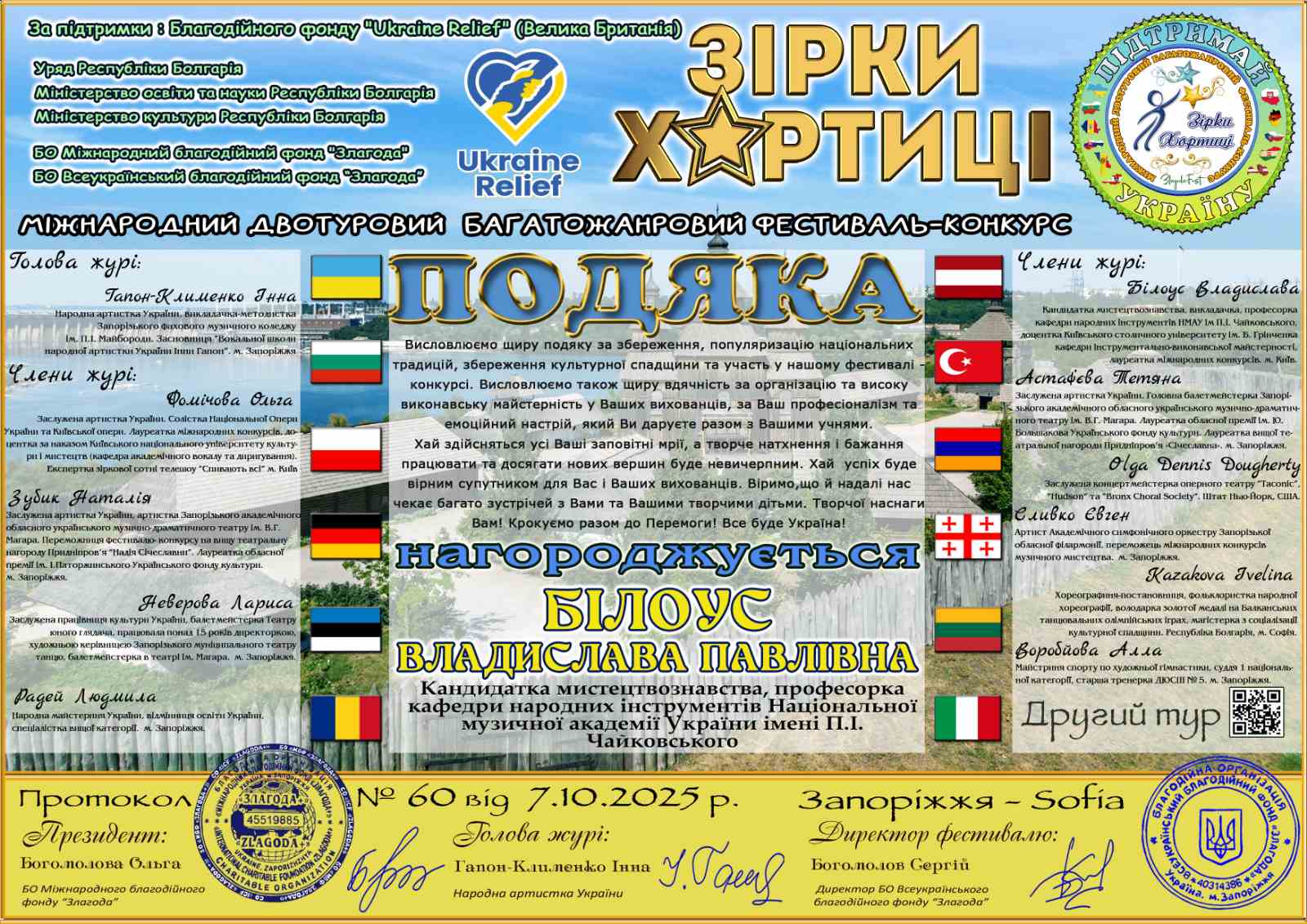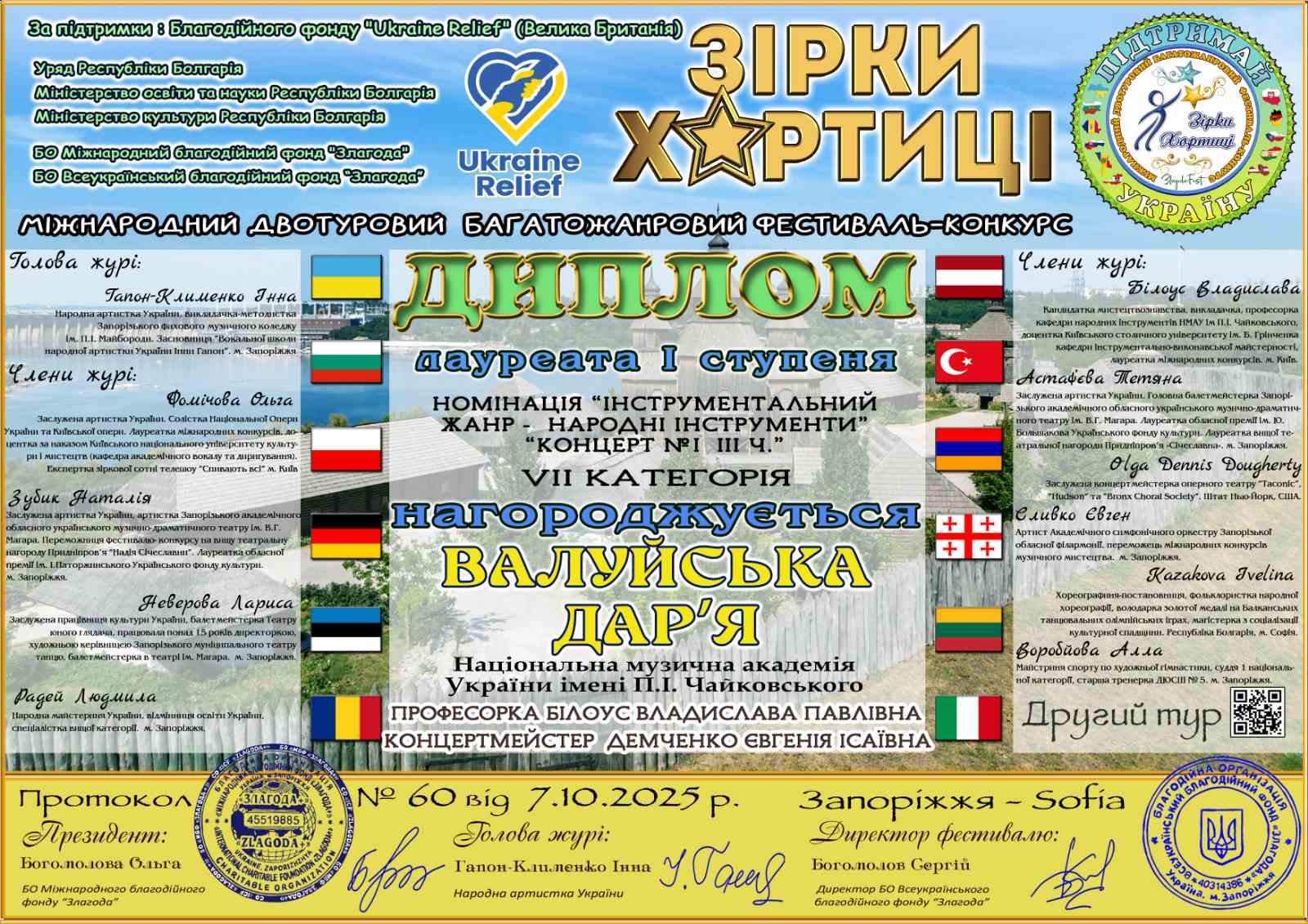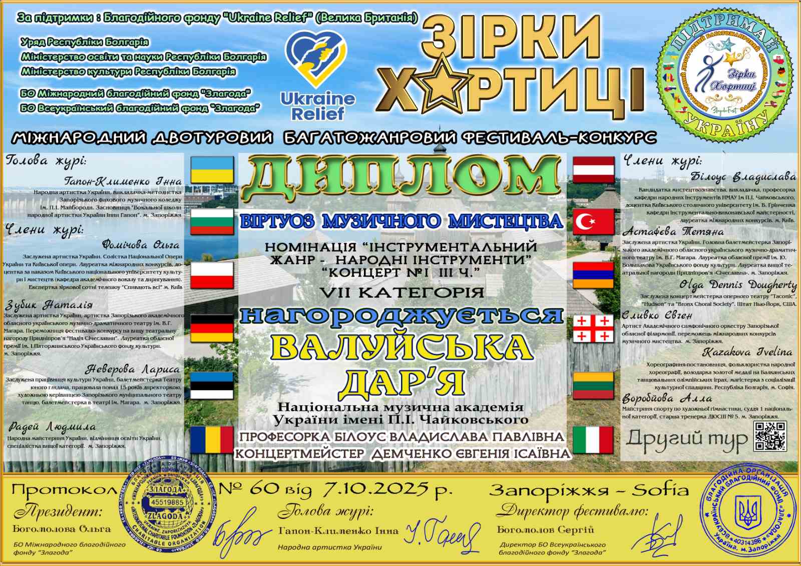 Диплом лауреата I ступення міжнародного двотурового багатожанрового фестивалю-конкурсу "Зірки Хортиці" та диплом віртуоза музичного мистецтва студентки III курсу кафедри народних інструментів НМАУ ім. П. І. Чайковського Дар'ї Валуйської (домра), клас професора Білоус В. П., концертмейстер Демченко Є. І. Номінація "інструментальний жанр - народні інструменти". Запоріжжя - Софія, 07.10.2025.