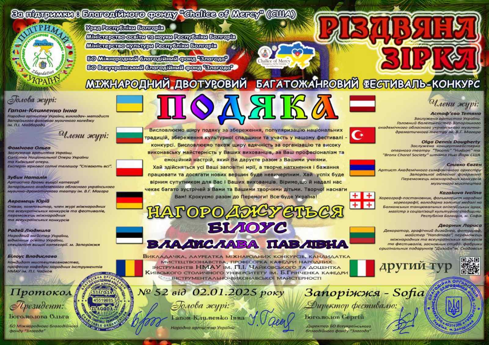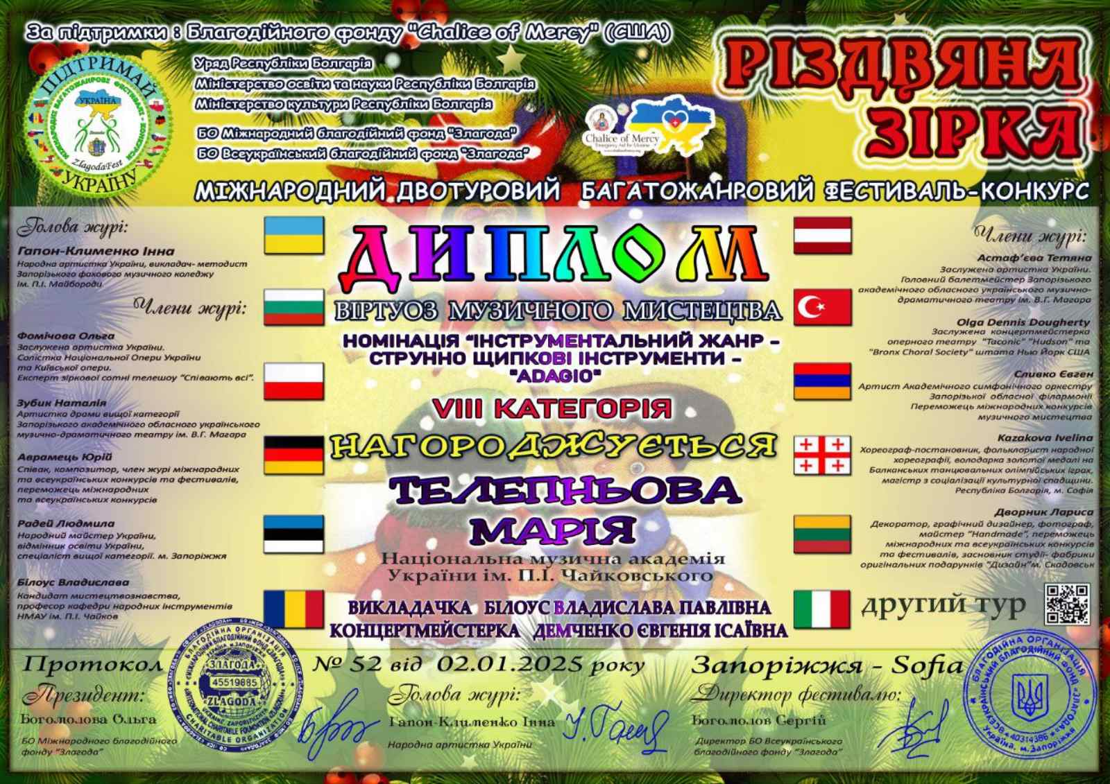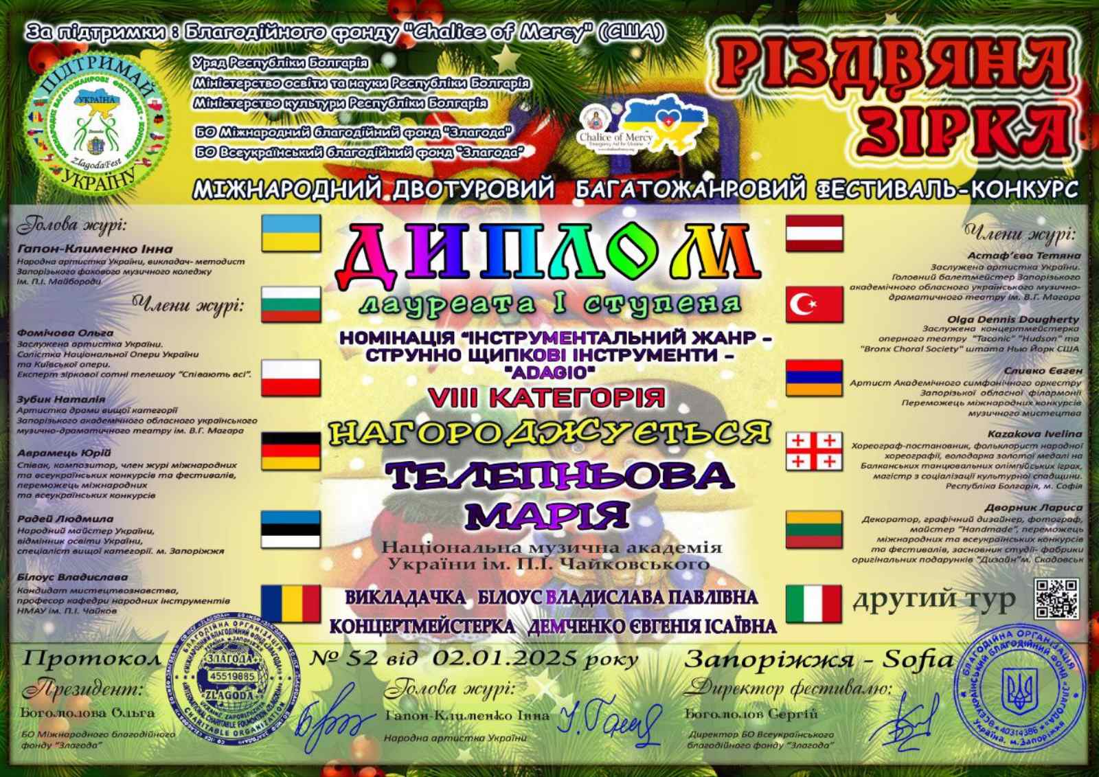 Диплом лауреата I ступення міжнародного двотурового багатожанрового фестивалю-конкурсу "Різдвяна Зірка" та диплом віртуоза музичного мистецтва магістра ІІ року навчання кафедри народних інструментів НМАУ ім. П. І. Чайковського Марії Телепньової (домра), клас професора Білоус В. П., концертмейтр Демченко Є. І. Номінація "Інструментальний жанр - струнно-щипкові інструменти", VIII категорія. Запоріжжя - Софія, 02.01.2025.