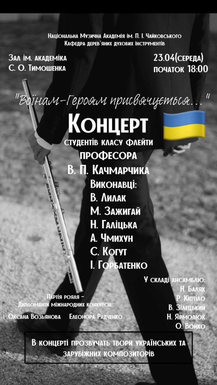 Національна музична академія ім. П.І. Чайковського. Кафедра дерев'яних духових інструментів. Зал ім. академіка С.О. Тимошенка. Відбувся 23.04.2025 о 18:00. "Воїнам-героям присвячується..." Концерт студентів класу флейти професора В.П. Качмарчика. Виконавці: В. Лилак, М. Зажигай, Н. Галіцька, А. Чмихун, С. Когут, І. Горбатенко. У складі ансамблю: Н. Баляк, Р. Кіптіло, В. Зілецький, Н. Ярмолюк, О. Войко. Партія роялю - Дипломанти міжнародних конкурсів: Оксана Возьянова та Елеонора Радченко. В концерті прозвучать твори українських та зарубіжних композиторів.