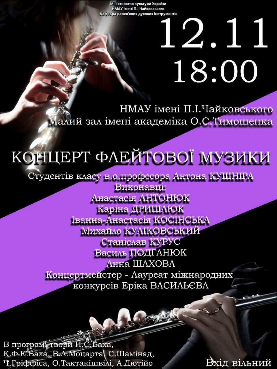 Міністерство культури України, НМАУ ім. П.І. Чайковського, кафедра дерев'яних духових інструментів. Концерт відбувся 12.11.2025 року об 18:00 в малому залі імені академіка О.С. Тимошенка. Концерт флейтової музики студентів класу в.о. професора Антона Кушніра. Виконавці: Анастасія Антонюк, Каріна Дришлюк, Іванна-Анастасія Косінська, Михайло Куліковський, Станіслав Курус, Василь Подганюк, Анна Шахова. Концкртмейстер - лауреат міжнародних конкурсів - Еріка Васильєва. В програмі твори Й.С. Баха, К.Ф.Е.Баха, В.А.Моцарта, С.Щамінада, Ч.Гріффіса, О.Тактакішвілі, А.Дютійо.